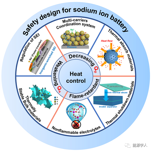 近期,武汉理工大学麦立强教授(通讯作者)和尤雅教授(通讯作者)从材料层面总结与分析了电池中主要产热来源,热失控过程引起的化学反应、衡量电池安全性的重要参数,并讨论了为降低热效应电极材料的设计准则。第一作者为武汉理工大学博士研究生杨超。文章主要围绕减少电池内部极化热(Qp)和副反应热(Qs)、加快热传递速率、阻燃和功能性热保护材料做了详细探讨。该文重点关注电池的热行为,并提出一些潜在可行的策略,这将加深对SIBs热失控的了解,并加速热安全体系电池材料的设计。该工作发表于材料领域期刊Advanced Energy Materials,题为“Materials Design for High-Safety Sodium-Ion Battery”。