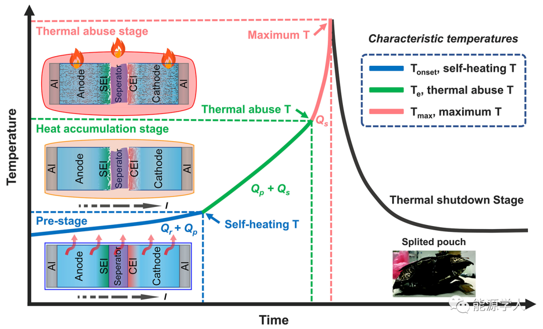 图2 钠离子电池热失控过程的示意图。右下插图显示的是热失控之后的烧焦的钠离子软包电池。