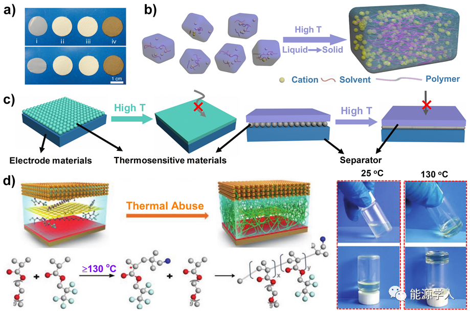 图6 a) Celgard隔膜(i)、玻璃纤维(ii)、GF/PVDF-HFP(iii)和GF/PVDF-HFP/PDA(iv)在室温下(顶部)和在200 °C下热处理30分钟(底部)后的照片。b)高温自聚电解质作为热停堆材料的原理图。c)热响应涂层和隔膜示意图。d)智能温度响应电解液(PPE)在电池中的热响应行为及其在热滥用条件下的自由基聚合机理的示意图,以及25°C和130°C热滥用后PPE的光学照片。
