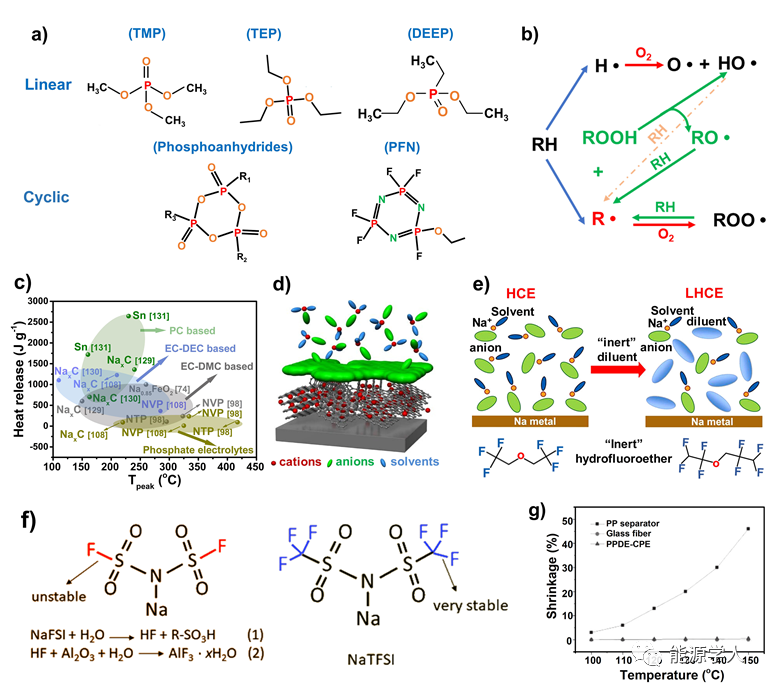 图5 a)几种代表性有机磷酸盐的化学结构。b)有机磷的阻燃机理。c)在PC-/EC-DEC-/EC-DMC电解液和磷酸盐电解液(NTP: NaTi2(PO4)3;NVP:NaV2(PO4)3)中各种电极材料的放热温度和总热量。d)阳离子在阻燃的高浓电解液中插入碳质负极的行为。e)从HCE到LHCE的稀释过程示意图,以及氢氟醚的代表性化学结构。f)NaFSI(左)和NaTFSI(右)的化学结构。(g)聚丙烯分离器、玻璃纤维和PPDE-CPE的热收缩率为100至150 °C。
