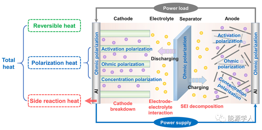 热来源:如图1所示,钠离子电池运行过程中产生的热量可分为三类:可逆热Qr、极化热Qp和副反应热Qs。可逆热Qr,通常是由于电化学反应过程中的可逆熵变ΔS引起的,极化热Qp是指充放电过程中由于欧姆极化、活化极化和浓差极化造成额外的能量消耗而产生的热量。Qs指在电池化学/电化学副反应引起的不可逆热,包括负极表面SEI和正极表面CEI的分解,电解质和电极材料之间的反应等。根据电化学反应和材料的本征性质不同,Qr既可能是吸热也可能是放热过程,而Qp和Qs通常为放热过程。如果电池中的放热反应失控,就会发生热失控事件,这是SIBs最具灾难性的失效模式之一。