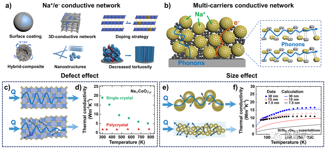 图3 a)Na+/e-导电网络构建策略的示意图。b)多载流子导电网络的示意图,包括Na+、e-和声子。c)完美晶格(顶部)和扭曲缺陷晶格(底部)中声子传输和散射的示意图。d)研究了NaxCoO2-y单晶和多晶样品的热导随温度的变化。e)顶部为大尺寸粒子间声子传输和散射示意图,底部为小尺寸粒子间声子传输和散射示意图。f)不同尺寸Si/SiGe超晶格的声子热导率。