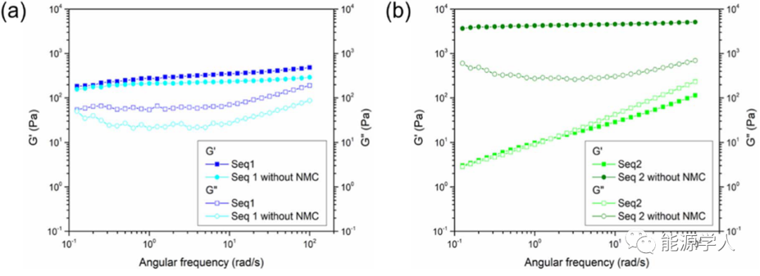 浆料流变性测试:流变性测试表明采用顺序2二制备的浆料具有更高的流动性,在少量NMP添加的情况下可获得与顺序1相似的性能。进一步研究表明这种结果是由于CB与NMC的干混减少了PVDF/NMP混合液中CB的含量,从而使浆料的粘度降低。而方法一中CB与PVDF溶液混合将形成凝胶状浆液并增加浆液的粘度。