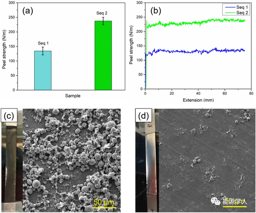 图5.两种顺序制备电极的粘结强度测量(a)剥离强度图(b)剥离强度-延伸率曲线(c)和(d)分别是剥离测试后对应于的电极表面