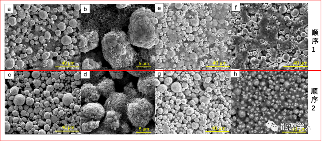 图3. 电极的SEM图像:压延前(a-d),压延后(e-h)。(a),(b)和(e)是使用顺序1制作的电极的上表面。(c),(d)和(g)是使用顺序2制作的电极的上表面。(f)和(h)分别是用顺序1和顺序2制成的电极的底表面(KOH溶液中除去铝集流体)