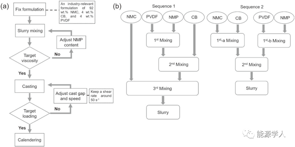 图1.(a)电极制造过程的优化策略。(b)制备电极浆料的混合顺序1和顺序2的示意图