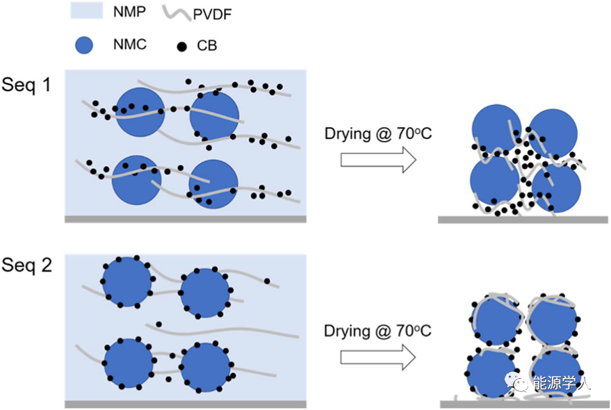 因此,顺序1制成的浆料的“强度”由PVDF链的缠结和CB的填充效应共同提供。顺序2制成的浆料的“强度”主要由PVDF链的缠结提供。导致顺序2制成的浆料流动性较好。在干燥过程中,使用顺序1制得的浆料随着NMP的蒸发,CB纳米颗粒被捕集在PVDF聚合物基质中,形成了填充NMC颗粒之间空间的多孔CB/PVDF簇。在干燥使用顺序2制得的浆料时,附着在NMC颗粒上的CB纳米颗粒会吸收PVDF,从而在NMC颗粒上形成致密的CB/PVDF层。