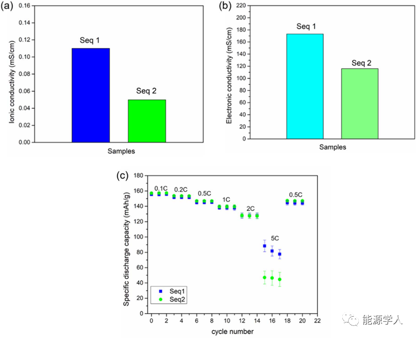 图6. 两种顺序制备电极的(a)离子电导率,(b)电子电导率和(c)倍率性能