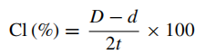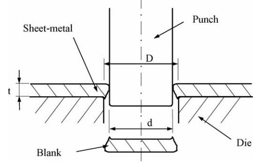 其中,CL为冲切间隙,D和d是上下模头的尺寸,t是板材厚度,如图2所示。而考虑到模具的磨损时,有效冲切间隙Cle定义为公式(2):