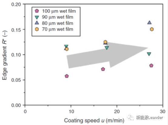 Marcel Schmitt等人锂离子电池负极浆料涂布工艺实验研究发现,涂布速度对厚边的无量纲厚度和宽度几乎没有影响,而会影响厚边的梯度特征R*,当涂布速度增加时,R*相应增加,即厚边缘厚度变化更尖锐,如图5所示。
