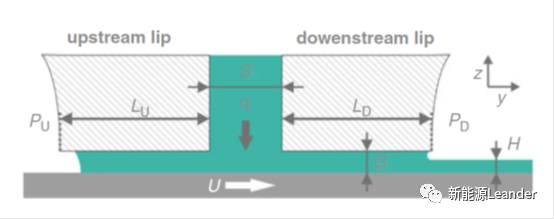 影响极片涂层厚边现象产生的因素主要有几个方面:(1)涂布模头的几何特征及涂布工艺参数,模头挤压涂布流场示意图如图4所示,模头几何参数和涂布工艺参数包括狭缝尺寸S、模头出口浆料流量q、模头与涂辊间隙尺寸G、涂布速度U、涂层湿厚H等;(2)浆料的性质,特别是浆料表面张力。