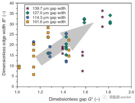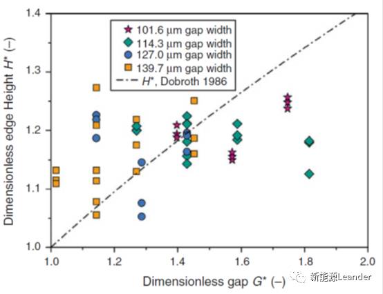 式中,q为浆料体积流量,H为涂层湿厚,G为涂布间隙。因此,厚边涂层厚度与无量纲涂布间隙G*相关。