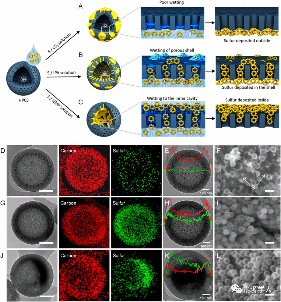 图1(A-C)比较三种不同硫溶解溶液渗透到HPCS中的示意图。(D,G,J)高倍TEM图像;(E,H,K)S/HPCS(CS2),(H)S/HPCS(CS2/IPA)和(K)S/HPCS(CS2/NMP)的高倍TEM图像和线EDX结果;(F,I和L)S/HPCS(CS2),(I)S/HPCS(CS2/IPA)和(L)S/HPCS(CS2/NMP)的低倍SEM图像。
