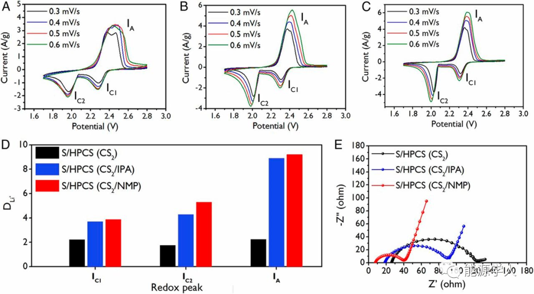 图3(A)S/HPCS(CS2),(B)S/HPCS(CS2/IPA)和(C)S/HPCS(CS2/NMP)正极的CV图。(D)每个正极和负极反应的锂离子相对扩散速率。(E) S/HPCS(CS2)、S/HPCS(CS2/IPA)和S/HPCS(CS2/NMP)正极的Nyquist图。
