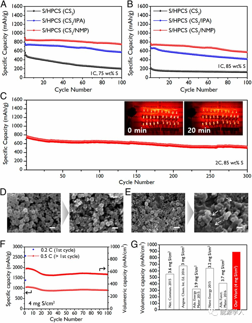 图5(A和B)S/HPCS(CS2)、S/HPCS(CS2/IPA)和S/HPCS(CS2/NMP)电池的循环性能。(C)硫含量为85%的S/HPCS(CS2/NMP)电池在2 C下的循环性能。(D)S/H-PCS(CS2/NMP)电极和(E)S/H-PCS(CS2)电极50次循环前后的SEM图像。(F)S/HPCS(CS2/NMP)电极在0.5 C下的比容量和容量。(G)实验结果与使用类似硫负载的最新结果的比较。