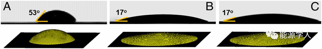 图2接触角和每个溶液滴碳表面润湿的模拟图像。