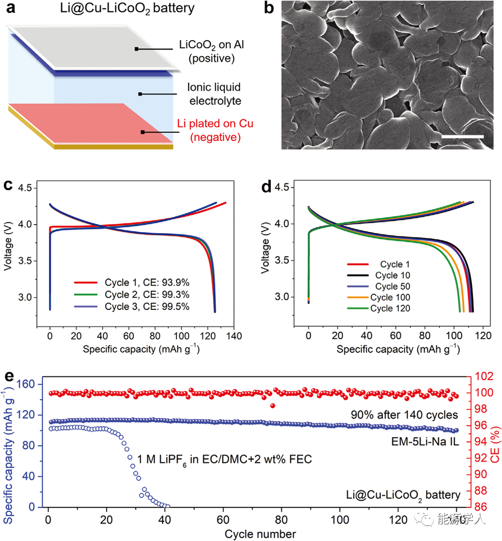 图4 采用EM-5Li-Na IL电解液的Li@Cu-LiCoO2电池。a) Li@Cu-LiCoO2电池结构示意图,电池负极为沉积了一定量Li金属的Cu箔。b)Cu表面沉积Li后(面容量:2 mAh cm−2)的表面形貌,比例尺:5 µm。c)采用 EM-5Li-Na IL电解液的Li@Cu - LiCoO2电池在0.25 C下的恒流充放电曲线。d) 采用 EM-5Li-Na IL电解液的Li@Cu-LiCoO2电池在0.7 C下的恒流充放电曲线。e)使用有机电解液和EM-5Li-Na IL电解液的Li@Cu -LiCoO2电池在0.7C下的循环稳定性曲线。(c-e)中LiCoO2的载量为≈10 mg cm−2,所沉积Li金属的容量约2倍过量。