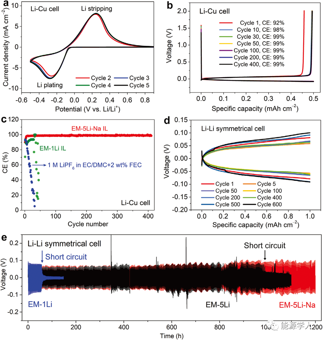 图2 不同离子液体电解液的电化学性能。a)采用 EM-5Li-Na IL电解液的Li-Cu电池的CV曲线,扫描速率为2mvs−1。b) 使用EM-5Li-NaIL电解液的Li-Cu电池进行Li沉积/溶解时的充放电曲线。c)分别采用传统有机电解液、EM-1Li和EM-5Li-Na IL电解液时Li-Cu电池中Li沉积/溶解的库仑效率。(b,c)中电流密度和面积比容量分别为0.5 mA cm−2和0.5 mAh cm−2。d)使用EM-5Li-Na IL电解液的Li/Li对称电池在不同循环次数下的Li沉积/溶解曲线。e)分别采用EM-1Li、EM-5Li和EM-5Li-Na IL电解液时Li /Li对称电池的Li沉积/溶解曲线。(e,f)中电流密度和面积比容量分别为1 mA cm−2和1 mAh cm−2。