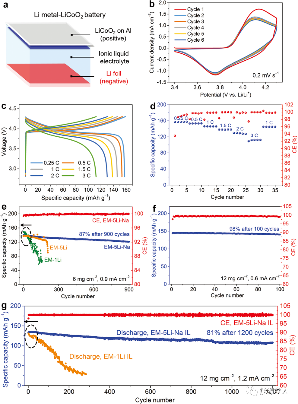 图3 采用EM-5Li-Na - IL电解液的Li-LiCoO2电池的电化学性能。a) Li-LiCoO2电池结构示意图。b)采用 EM-5Li-Na IL电解液的Li-LiCoO2电池的CV曲线,扫描速率为2mv s−1。c) 使用EM-5Li-Na IL电解液的Li-LiCoO2电池在不同倍率下(0.25-3 C)的恒流充放电曲线。d) 使用EM-5Li-Na IL电解液的Li-LiCoO2电池的倍率性能。(b-d)中LiCoO2的载量为≈6 mg cm−2。e) 使用EM-1Li、EM-5Li和EM-5Li-Na IL电解液的Li-LiCoO2电池在1 C下的循环稳定性曲线,LiCoO2的载量为≈6 mg cm−2。f)使用EM-5Li-Na IL电解液的Li - LiCoO2电池在0.35 C下的循环性能曲线,LiCoO2的载量为≈12 mg cm−2。g)分别采用EM-1Li和EM-5Li-NaIL电解液时Li-LiCoO2电池的循环性能曲线,LiCoO2的载量为≈12 mg cm−2,所有电池先在0.25 C下循环2次,随后在0.7 C(≈1.2 mA cm−2) 下进行循环性能比较。