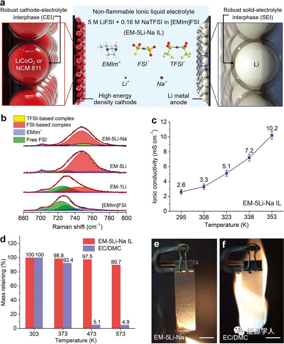 图1 不易燃离子液体电解液的特性。a) EM-5Li-Na IL电解液的组成与电池结构示意图。b)纯[EMIm]FSI、EM-1Li、EM-5Li和EM-5Li-Na ILs的拉曼光谱。c) EM-5Li-Na IL在不同温度下的离子电导率。d) EM-5Li-Na IL电解液与常规有机电解液(1 M LiPF6-EC/DMC, 1:1 vol)的热稳定性分析。e,f) EM-5Li-Na IL电解液(e)传统1 M LiPF6-EC/DMC有机电解液(f)的易燃性测试