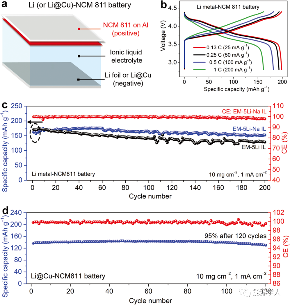 图5 采用EM-5Li-Na-IL电解液的NCM811基锂金属电池。a) NCM811基锂金属电池结构示意图,负极为Li金属或Li@Cu。b) NCM811基锂金属电池不同倍率下(0.25-1 C,25-200 mA g-1)的恒流充放电曲线。c) 分别使用EM-5Li和EM-5Li-NaIL电解液的Li-NCM811电池在0.5 C下的循环稳定性。(b-c)中的比容量均基于NCM811的质量。d) 使用EM-5Li-Na IL电解液的Li@Cu-NCM811电池在0.5 C下的的循环稳定性。所沉积Li金属的容量约1.8倍过量。(d)中比容量基于正、负极总质量。(a-d)中NCM811的载量为≈10 mgcm−2。